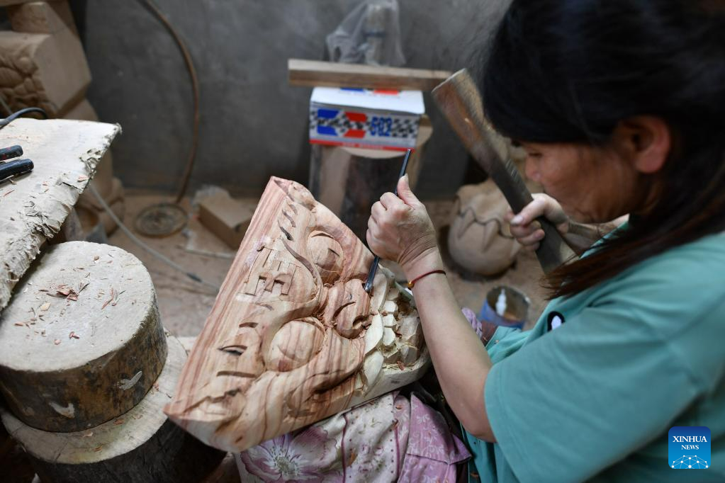 A craftswoman carves a part of a dragon boat in Fangzhuang Village, Minhou County, Fuzhou City, southeast China's Fujian Province, June 12, 2023.