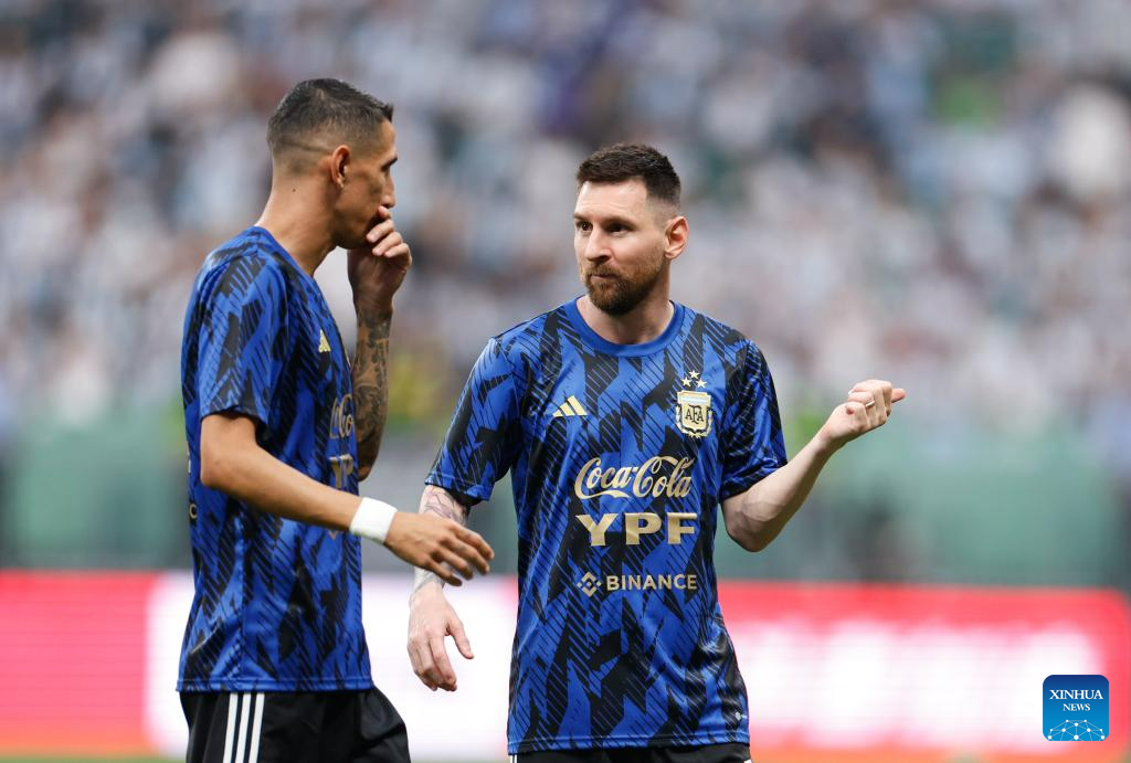 Lionel Messi (R) of Argentina talks with teammate Angel di Maria ahead of an international football invitational between Argentina and Australia in Beijing, capital of China, June 15, 2023. (Xinhua/Wang Lili)