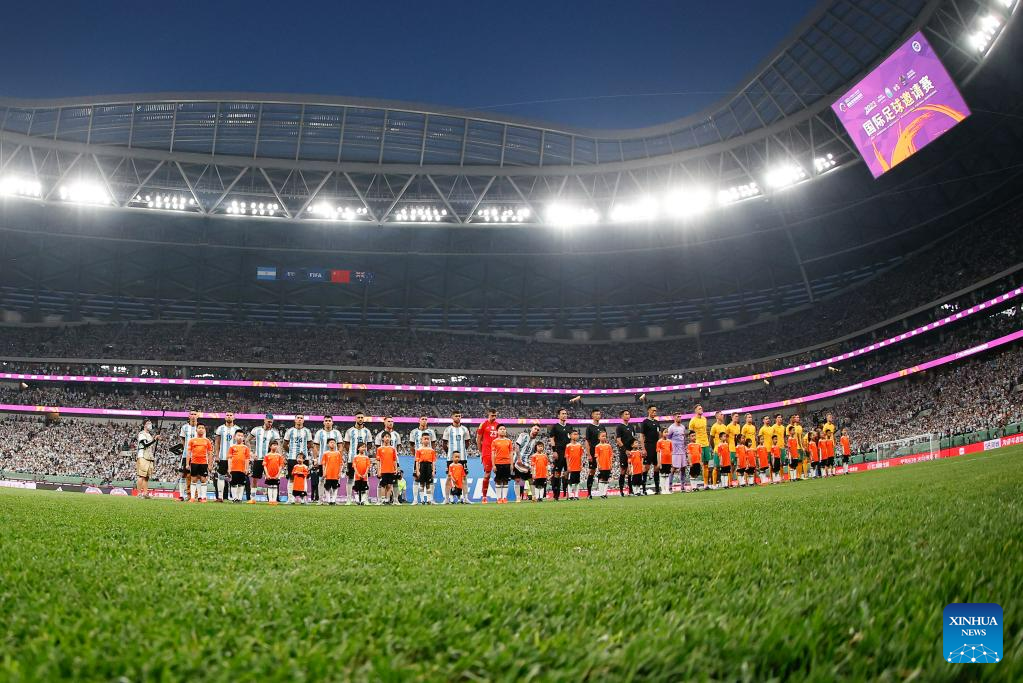 Players of both sides enter the field of play ahead of an international football invitational between Argentina and Australia in Beijing, capital of China, June 15, 2023. (Xinhua/Wang Lili)