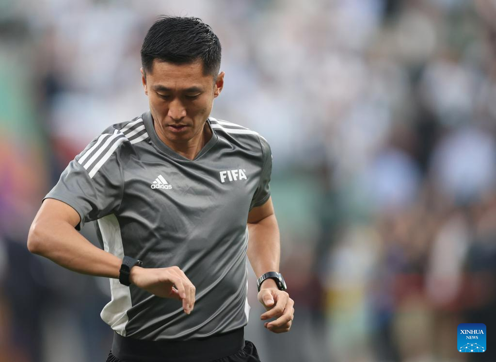 Referee Ma Ning warms up ahead of an international football invitational between Argentina and Australia in Beijing, capital of China, June 15, 2023. (Xinhua/Jia Haocheng)