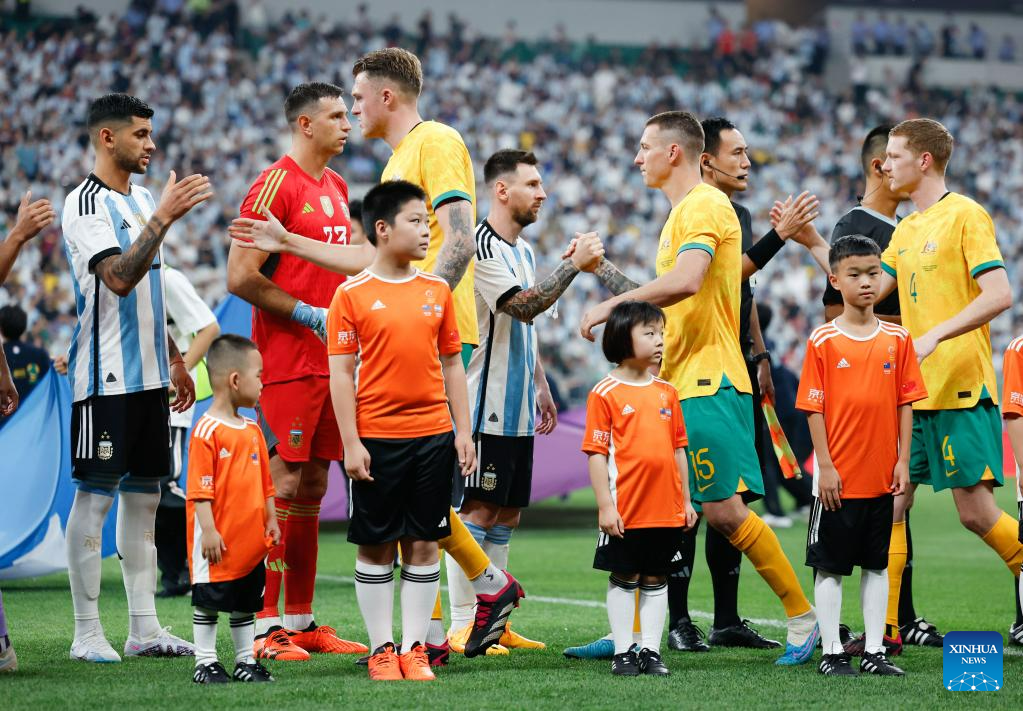 Players of both sides shake hands ahead of an international football invitational between Argentina and Australia in Beijing, capital of China, June 15, 2023. (Xinhua/Wang Lili)