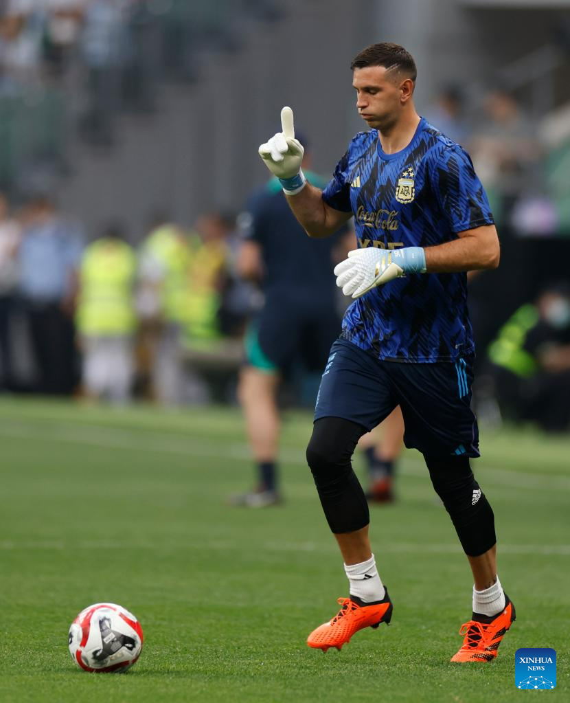 Emilliano Martinez, goalkeeper of Argentina, warms up ahead of an international football invitational between Argentina and Australia in Beijing, capital of China, June 15, 2023. (Xinhua/Zhang Chen)