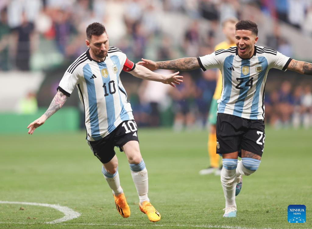 Players of Argentina celebrate the goal of Lionel Messi during an international football invitational between Argentina and Australia in Beijing, capital of China, June 15, 2023. (Xinhua/Jia Haocheng)