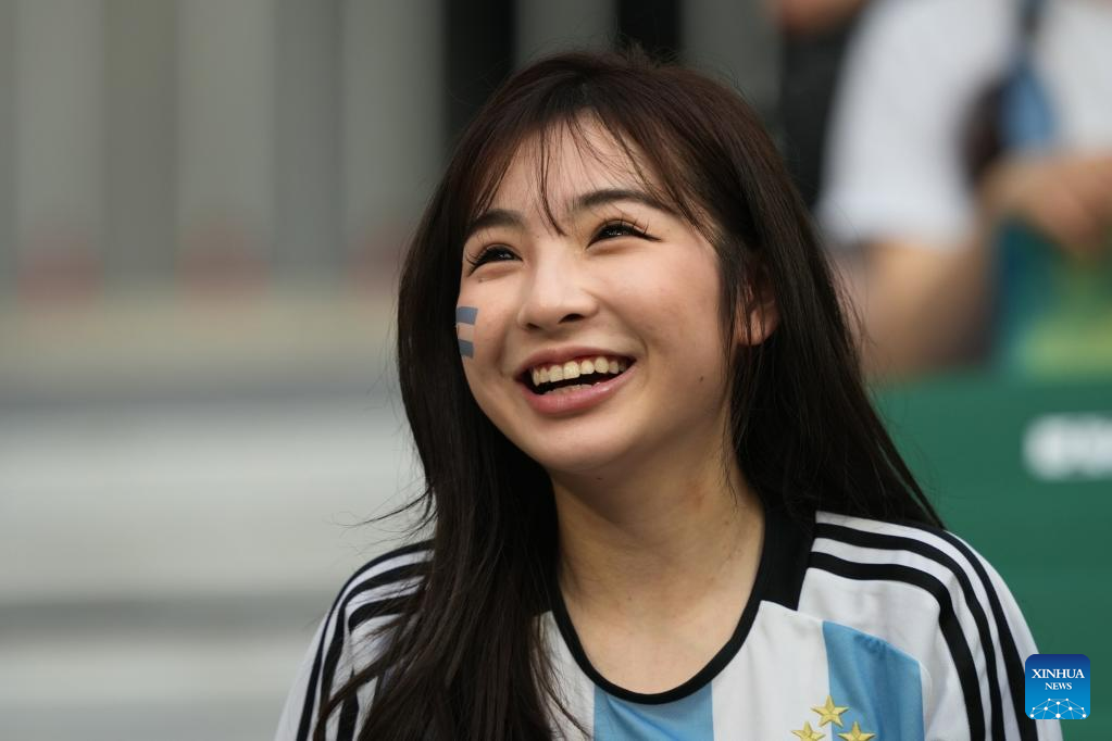 A fan is seen ahead of an international football invitational between Argentina and Australia in Beijing, capital of China, June 15, 2023. (Xinhua/Jia Haocheng)