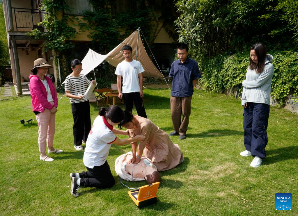 Operators of homestay take part in a CPR training in Xiantan Village, Moganshan Town, Deqing County, east China's Zhejiang Province, June 15, 2023. Deqing County on Thursday offered a training program to the owners and operators of local homestays to further improve services. The county has witnessed an ongoing growth of premium homestays, most notably in Moganshan Town. In 2022, homestay operator was added to China's list of new occupations by the Ministry of Human Resources and Social Security. (Xinhua/Han Chuanhao)