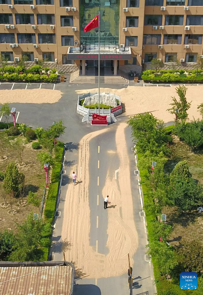 This aerial photo shows farmers drying grain at the government compound of Linyi Town in Linyi County, east China's Shandong Province, June 13, 2023. As the latest round of heatwaves coincides with the summer harvest season, many cities in Shandong have opened government compounds and village entertainment venues and squares for farmers to dry their grain. (Xinhua/Xu Suhui)