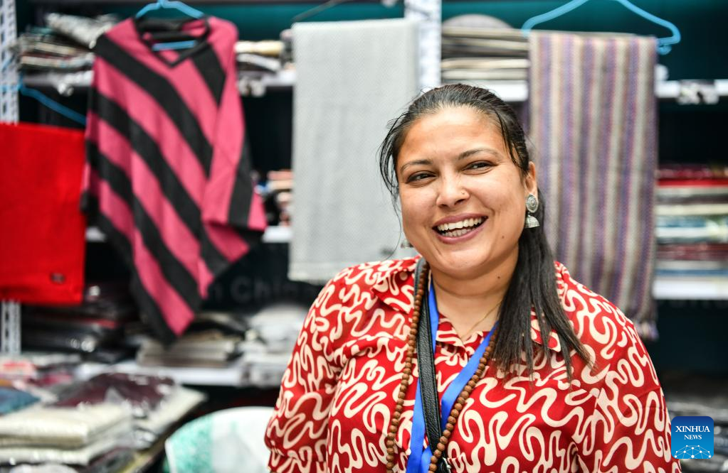 A trader selling products from Vietnam at the 5th China Xizang Tourism and Culture Expo in Lhasa, capital of southwest China's Tibet Autonomous Region, June 18, 2023. The expo is one of the most important events on Tibet's cultural calendar. (Xinhua/Jigme Dorje)