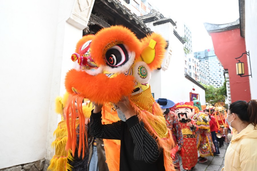 People take part in a parade welcoming the God of Wealth at Sanfangqixiang (Three Lanes and Seven Alleys), an ancient block in downtown Fuzhou, southeast China's Fujian Province, Jan. 26, 2023. (Xinhua/Lin Shanchuan)