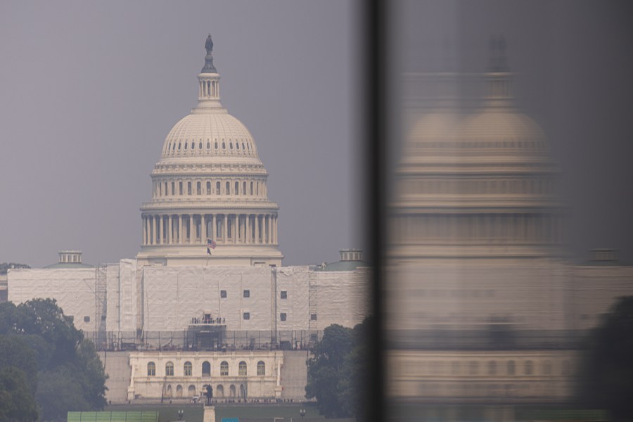 The U.S. Capitol building is shrouded in haze, as smoke from wildfires in Canada brings unhealthy air quality to the East Coast, in Washington, D.C., the United States, on June 7, 2023. (Photo by Aaron Schwartz/Xinhua)
