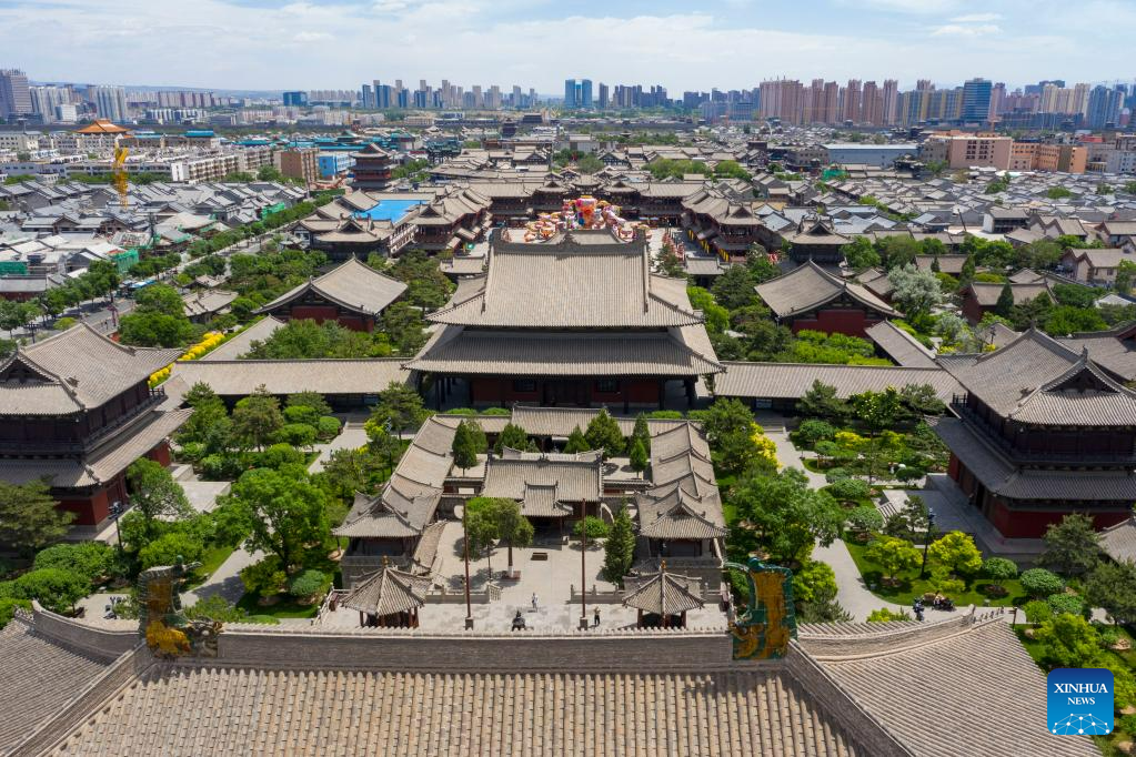 This aerial photo taken on June 8, 2023 shows a view of Datong ancient town in Datong, north China's Shanxi Province. Datong, with a history of over 2,000 years, is one of China's ancient capitals. In recent years, Datong has developed its tourism combining rich cultural heritages and well-known attractions. The historic city is shining with a new vitality. (Xinhua/Yang Chenguang)