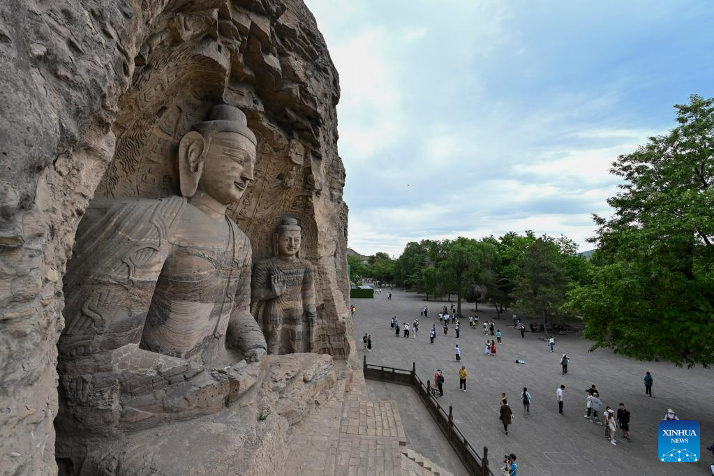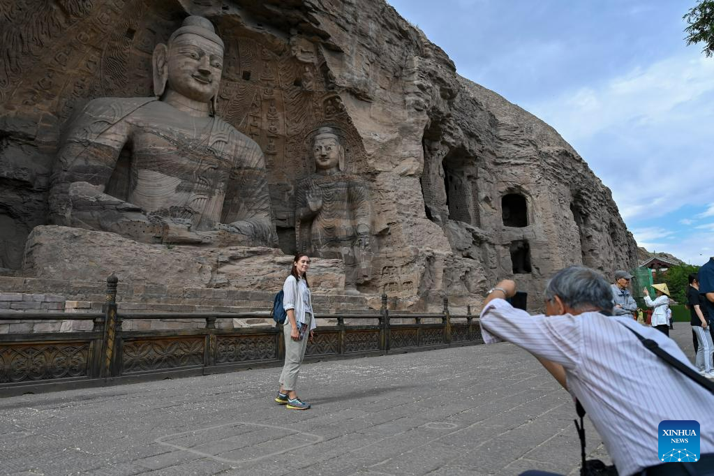 People visit the Yungang Grottoes in Datong, north China's Shanxi Province, June 7, 2023. Datong, with a history of over 2,000 years, is one of China's ancient capitals. In recent years, Datong has developed its tourism combining rich cultural heritages and well-known attractions. The historic city is shining with a new vitality. (Xinhua/Yang Chenguang)