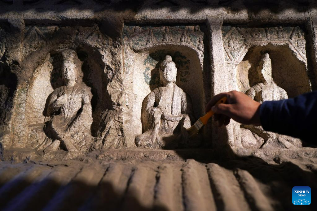 A technician with the Yungang Grottoes Research Institute maintains a piece of relics at the Yungang Grottoes in Datong, north China's Shanxi Province, May 7, 2021. Datong, with a history of over 2,000 years, is one of China's ancient capitals. In recent years, Datong has developed its tourism combining rich cultural heritages and well-known attractions. The historic city is shining with a new vitality. (Xinhua/Zhan Yan)