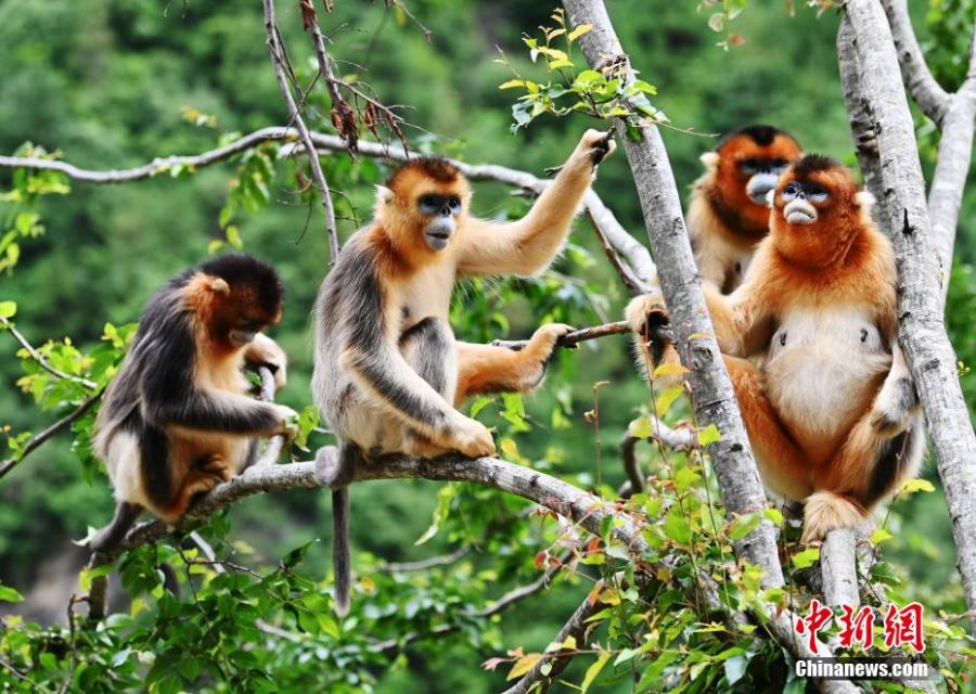 Golden snub-nosed monkeys rest on a tree at Baihe National Nature Reserve in Jiuzhaigou County, Aba Prefecture, southwest China's Sichuan Province, June 17, 2023. (Photo: China News Service/An Yuan)