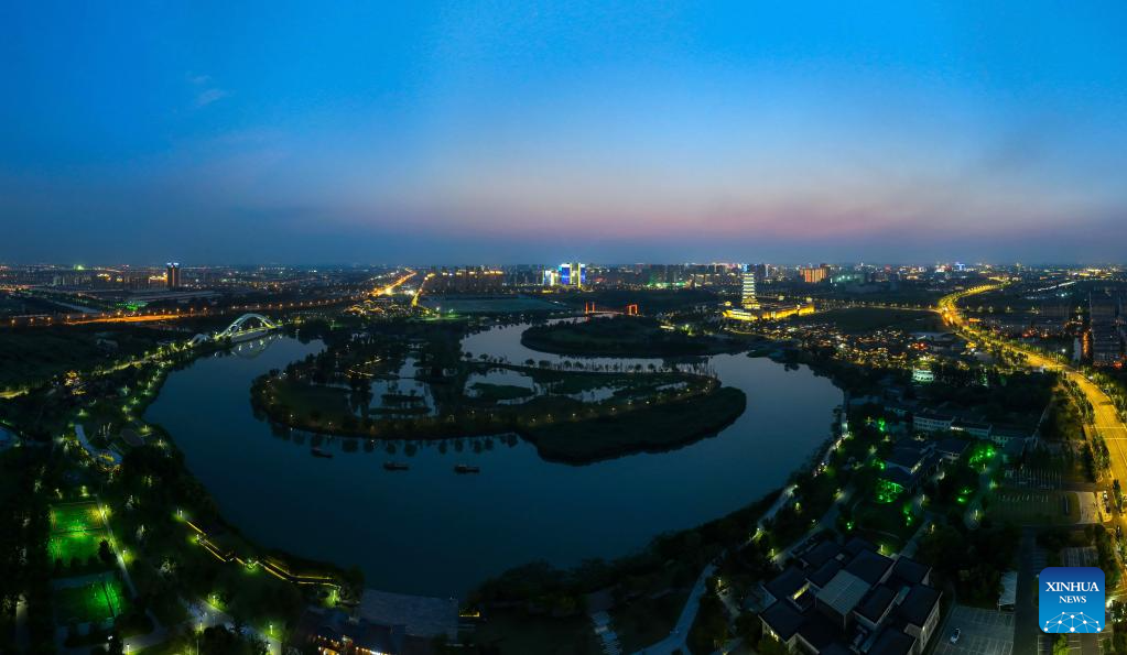 This aerial photo taken on June 14, 2023 shows a night view of China Grand Canal Museum along the Grand Canal in Yangzhou, east China's Jiangsu Province. (Xinhua/Ji Chunpeng)