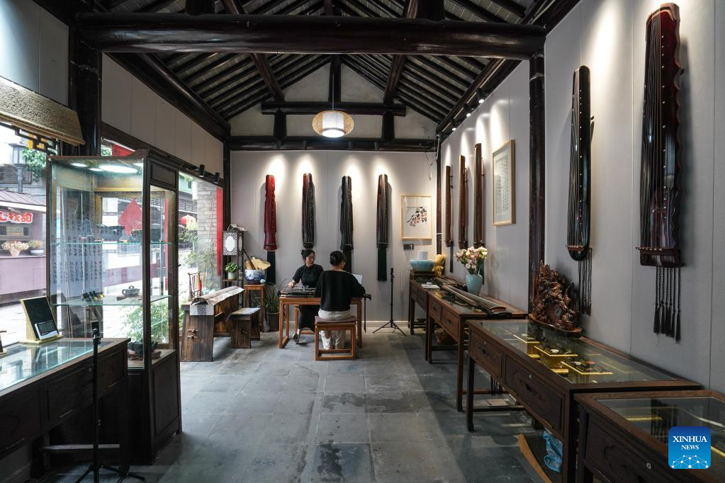 A student plays the Guqin under her teacher's guidance at an instrument shop in Yangzhou, east China's Jiangsu Province, June 15, 2023. (Xinhua/Yang Lei)