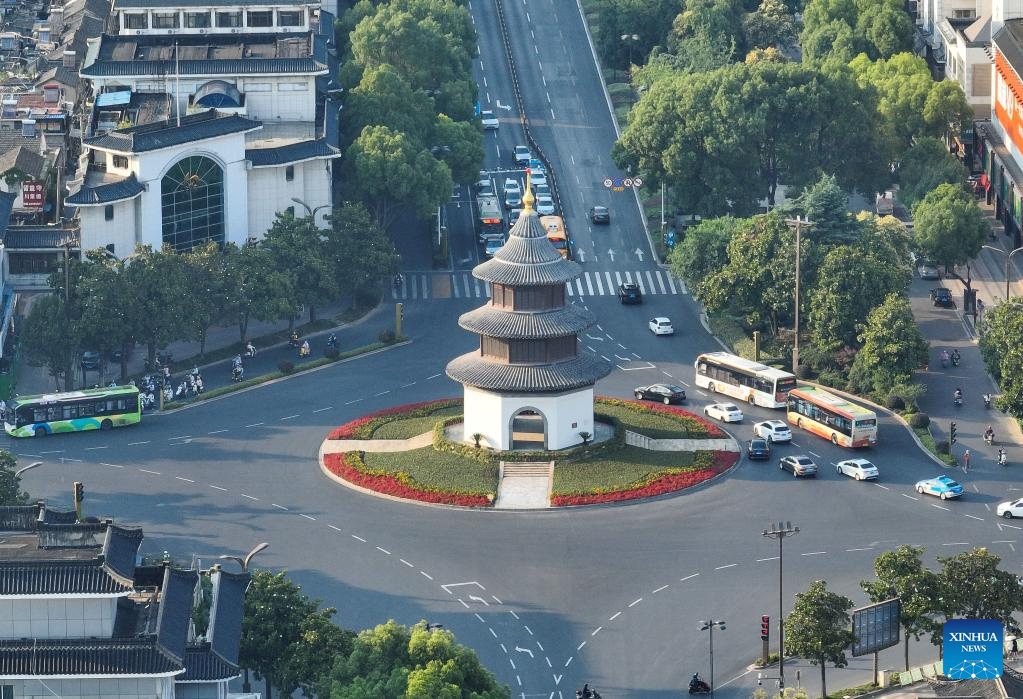 This aerial photo taken on June 14, 2023 shows a street view of Yangzhou, east China's Jiangsu Province. (Xinhua/Li Bo)
