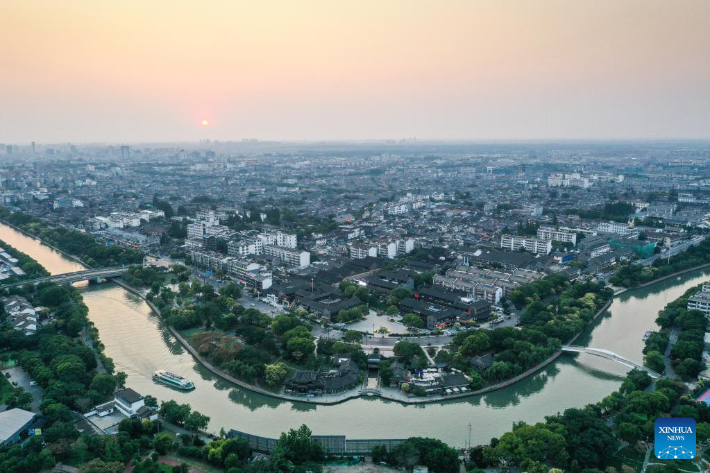 This aerial photo taken on June 14, 2023 shows a view of the Sanwan canal scenic area in Yangzhou, east China's Jiangsu Province. (Xinhua/Ji Chunpeng)