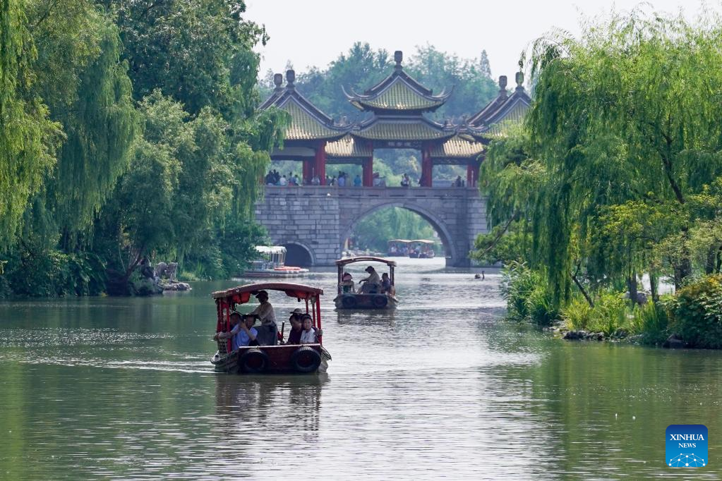 People take a boat tour at the Slender West Lake scenic spot in Yangzhou, east China's Jiangsu Province, June 15, 2023. (Xinhua/Li Bo)