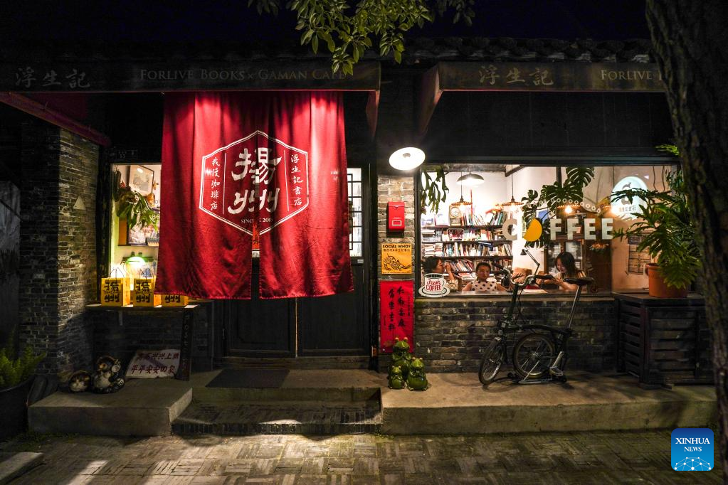 This aerial photo taken on June 14, 2023 shows a night view of a bookstore in Yangzhou, east China's Jiangsu Province. (Xinhua/Yang Lei)