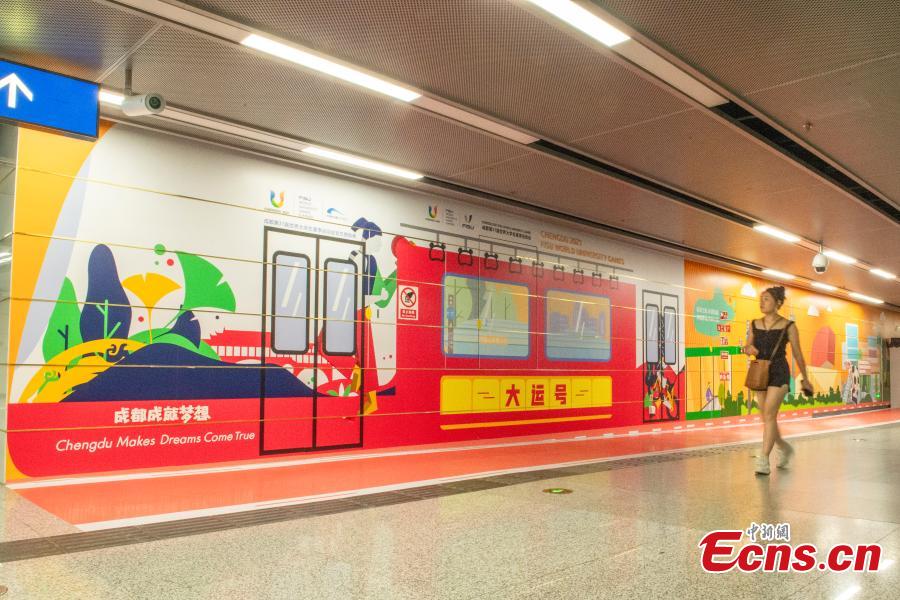 Passengers walk at a Universiade themed subway station in Chengdu, southwest China's Sichuan Province, June 20, 2023. (Photo: China News Service/Liu Zhongjun)