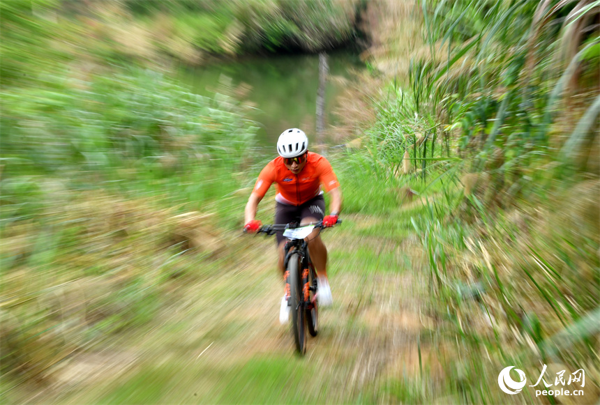 A cyclist competes in a mountain bike cross-country race in an eco-friendly tea plantation in Renshou township, Jing'an county, east China's Jiangxi Province, June 18, 2023. (People's Daily Online/Shi Yu)
