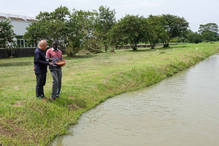 Chinese agriculture expert Chen Taihua (L) talks to Godfrey Kityo, a fish breeding technician, at the Aquaculture Research and Development Centre in Kajjansi, Wakiso District, Uganda, Dec. 21, 2022. (Photo by Hajarah Nalwadda/Xinhua)