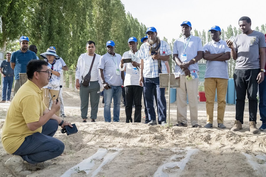 A Chinese expert introduces desert plants to people from central Asian countries at a desert research station in northwest China's Xinjiang Uygur Autonomous Region, June 13, 2023. (Xinhua/Zhou Shengbin)