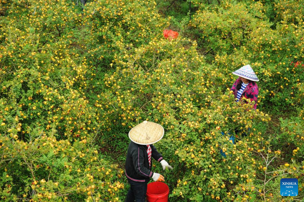 Now, this unassuming wild fruit has become a catalyst for prosperity among local farmers. More than 2.1 million mu (about 140,000 hectares) of land are given over to thorn pear cultivation in Guizhou, making it the leading region in the country. The overall output value has surged from nearly 3.69 billion yuan (about 500 million U.S. dollars) in 2019 to 15 billion yuan last year.