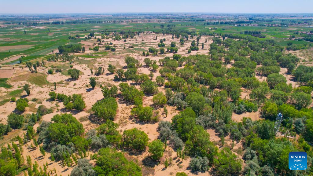 This aerial photo taken on June 14, 2023 shows a state forestry area in Linhe District of Bayannur, north China's Inner Mongolia Autonomous Region. (Xinhua/Liu Lei)