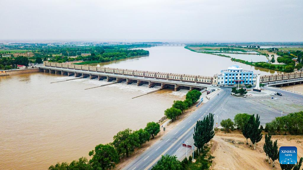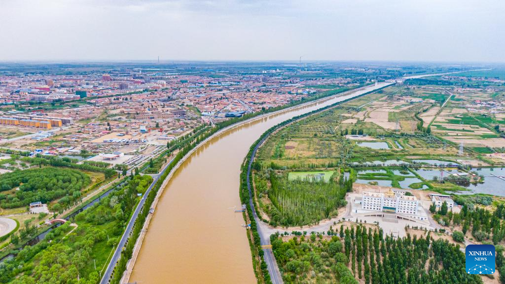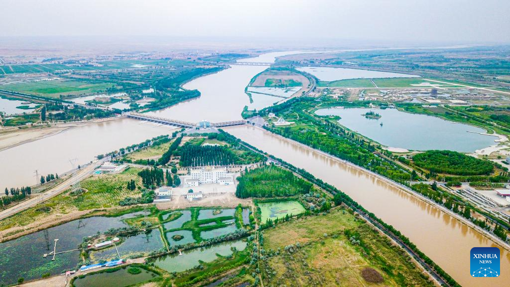 This aerial photo taken on June 18, 2023 shows the Sanshenggong Water Control Project in Dengkou County in Bayannur, north China's Inner Mongolia Autonomous Region. (Xinhua/Peng Yuan)