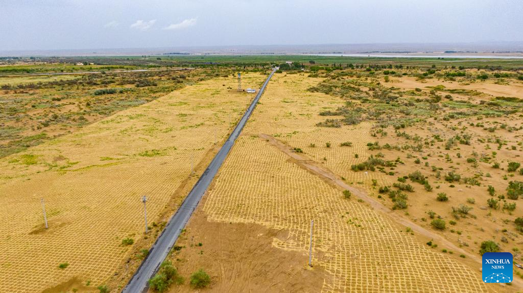 This aerial photo taken on June 18, 2023 shows straw checkerboards, a local method to prevent the sand from moving, in the Ulan Buh Desert in Dengkou County in Bayannur, north China's Inner Mongolia Autonomous Region. (Xinhua/Peng Yuan)