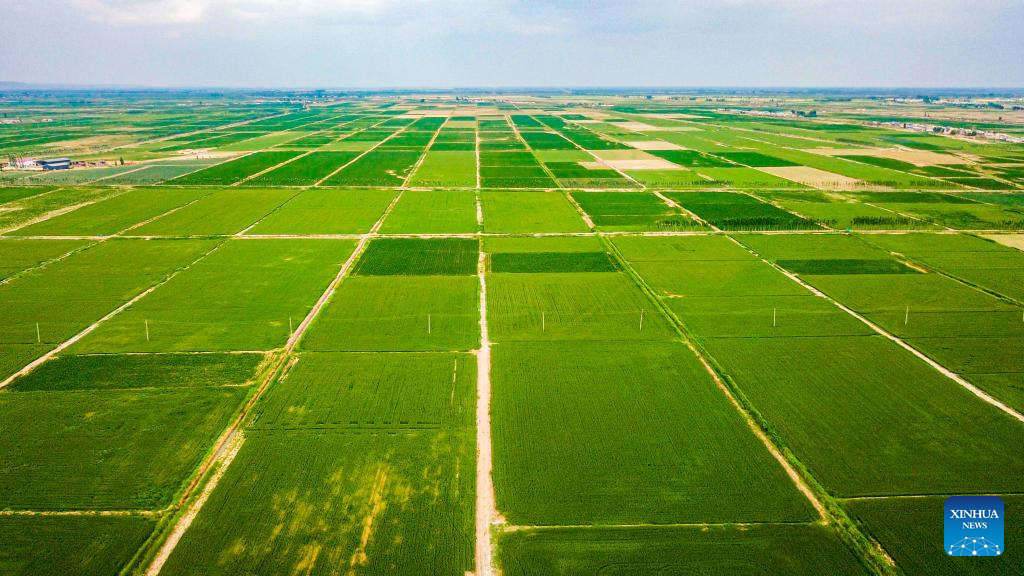 This aerial photo taken on June 18, 2023 shows the Hetao irrigation area in Dengkou County in Bayannur, north China's Inner Mongolia Autonomous Region. (Xinhua/Peng Yuan)