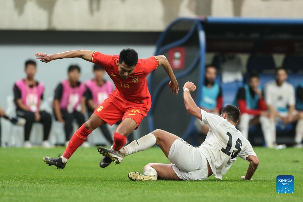 Wang Ziming (Top) of China breaks through during an international friendly football match between China and Palestine in Dalian, northeast China's Liaoning Province, June 20, 2023. (Xinhua/Long Lei)