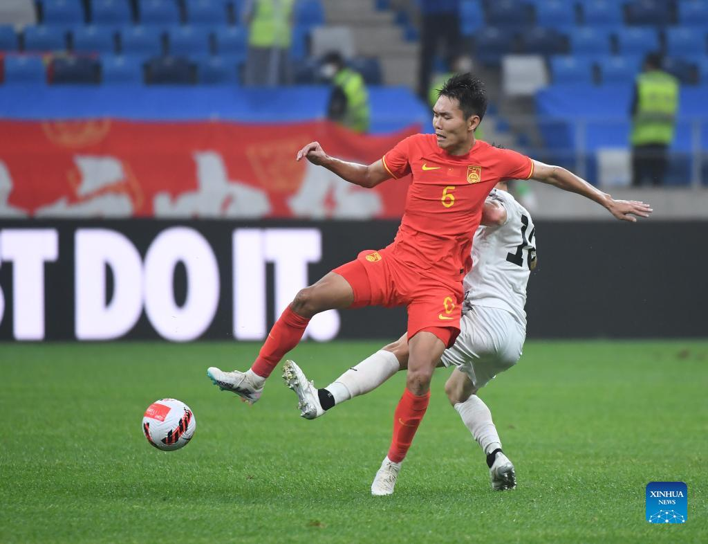 Wang Shangyuan (L) of China competes during an international friendly football match between China and Palestine in Dalian, northeast China's Liaoning Province, June 20, 2023. (Xinhua/Long Lei)