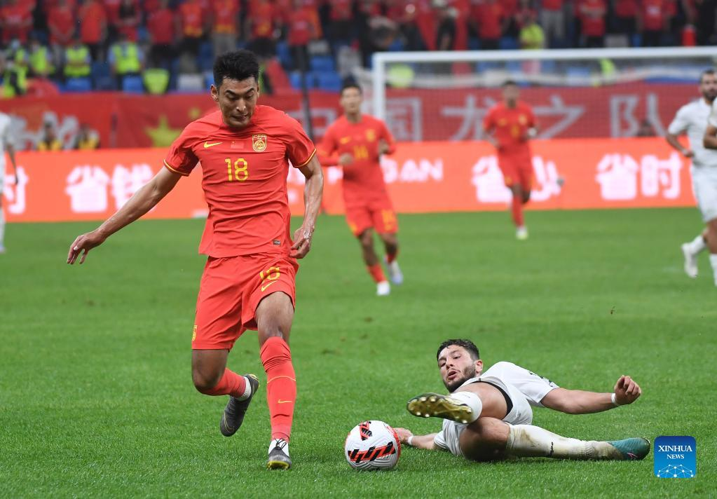Xu Xin (1st R) of China breaks through during an international friendly football match between China and Palestine in Dalian, northeast China's Liaoning Province, June 20, 2023. (Xinhua/Pan Yulong)