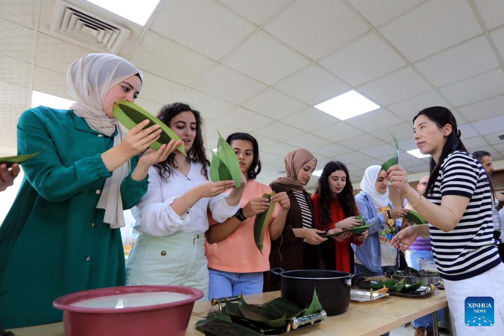 Students learn to make Zongzi, a traditional Chinese food, during a celebration of Dragon Boat Festival in Amman, Jordan, on June 20, 2023. (Photo by Mohammad Abu Ghosh/Xinhua)