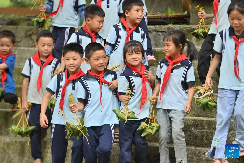 Students walk with freshly made Zongzi in Dangjiu Village, Gandong Township of Rongshui Miao Autonomous County, south China's Guangxi Zhuang Autonomous Region, June 20, 2023. (Xinhua/Huang Xiaobang)