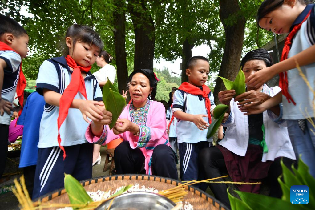 Students learn from the elders to make Zongzi in Dangjiu Village, Gandong Township of Rongshui Miao Autonomous County, south China's Guangxi Zhuang Autonomous Region, June 20, 2023. (Xinhua/Huang Xiaobang)