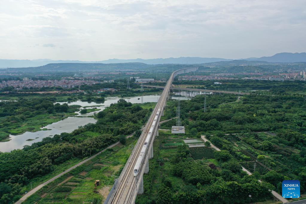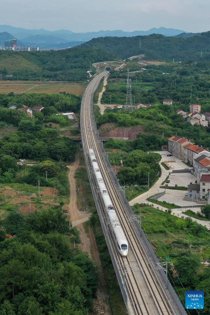 This aerial photo taken on June 19, 2023 shows a bullet train running on the Hangzhou-Shaoxing-Taizhou intercity railway in Shengzhou, east China's Zhejiang Province. (Xinhua/Huang Zongzhi)