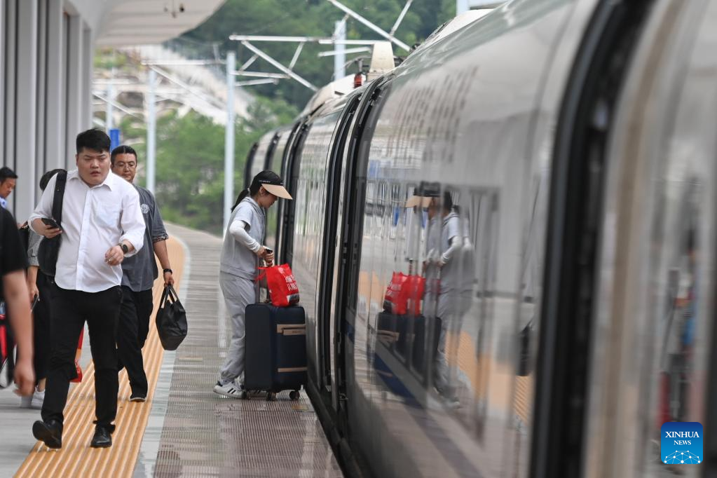 Passengers board a train at Xinchang Railway Station on the Hangzhou-Shaoxing-Taizhou intercity railway in east China's Zhejiang Province, June 19, 2023. (Xinhua/Huang Zongzhi)