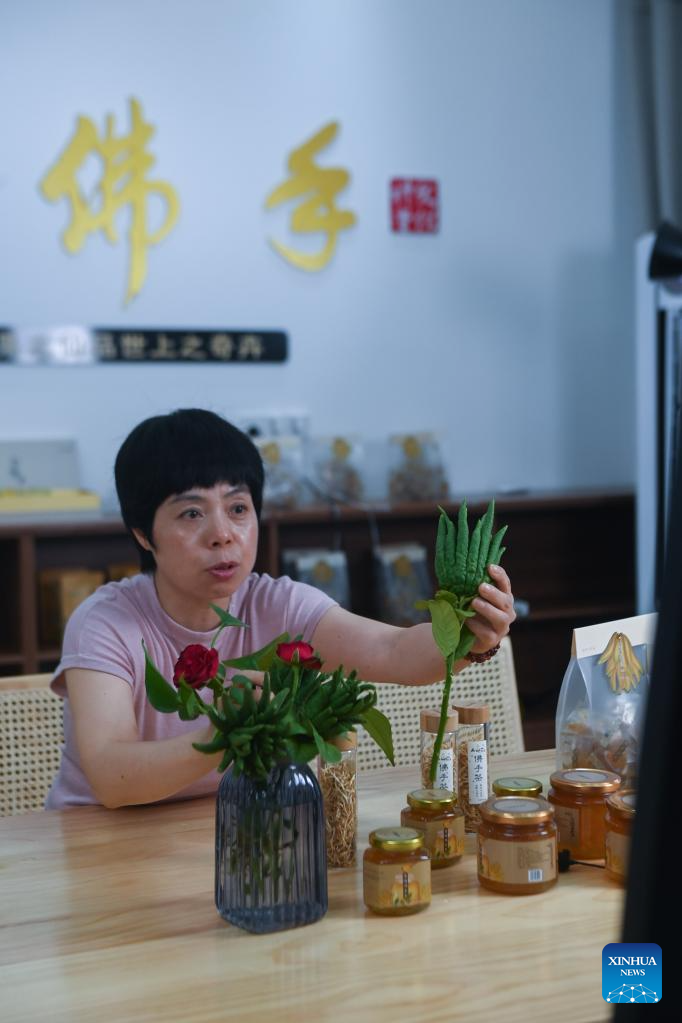 A farmer markets fingered citron products via livestreaming in Beishankou Village of Chisong Town in Jindong District of Jinhua City, east China's Zhejiang Province, June 20, 2023. Based on the integration of tourism and agriculture, Jindong District has fostered a rural industrial development belt among its administrative villages with local distinctive industries. (Xinhua/Xu Yu)