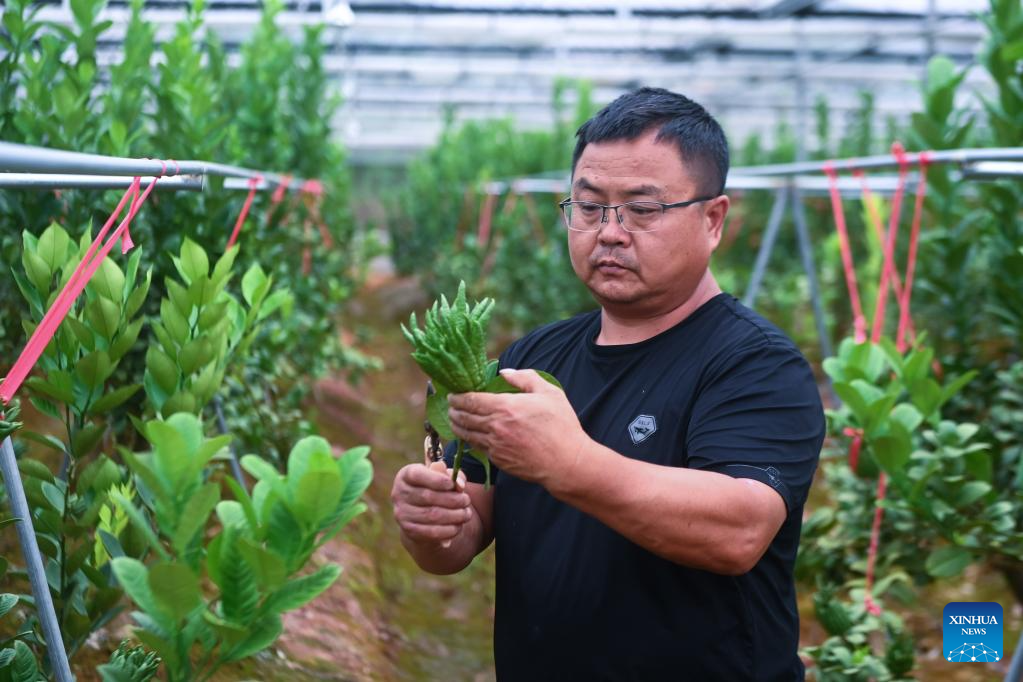 A farmer checks the growth of fingered citron plants at a plantation in Beishankou Village of Chisong Town in Jindong District of Jinhua City, east China's Zhejiang Province, June 20, 2023. Based on the integration of tourism and agriculture, Jindong District has fostered a rural industrial development belt among its administrative villages with local distinctive industries. (Xinhua/Xu Yu)