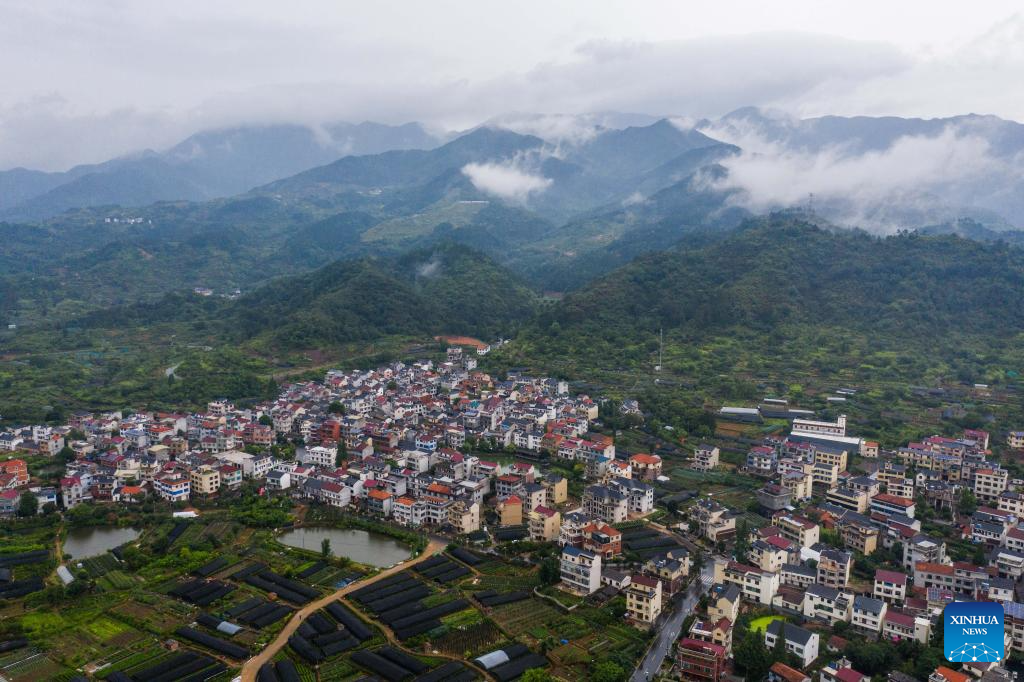 This photo taken on June 20, 2023 shows a view of Beishankou Village of Chisong Town in Jindong District of Jinhua City, east China's Zhejiang Province. Based on the integration of tourism and agriculture, Jindong District has fostered a rural industrial development belt among its administrative villages with local distinctive industries. (Xinhua/Xu Yu)