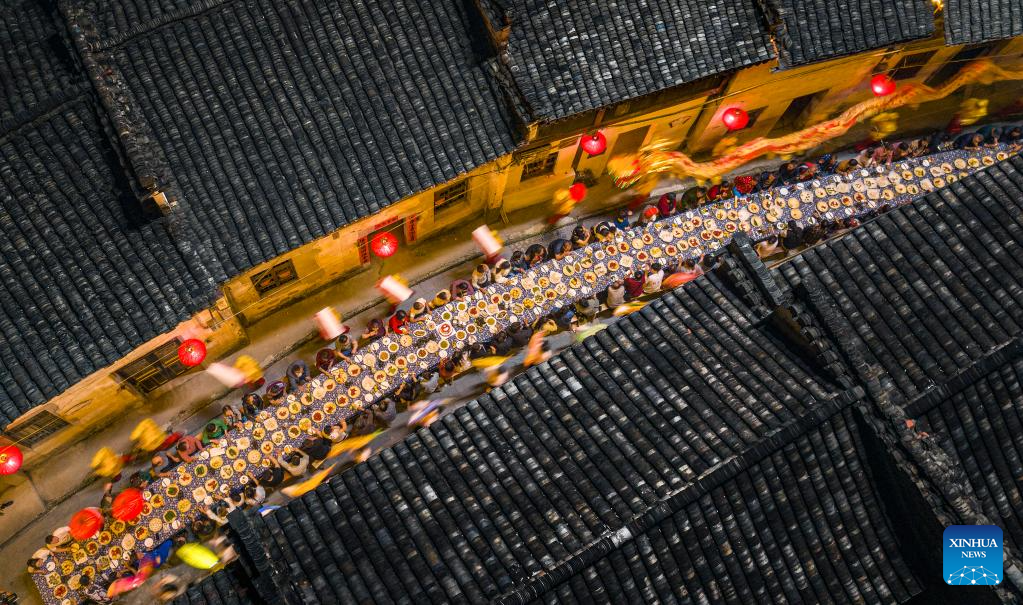 This aerial photo taken on June 16, 2023 shows a lantern performance by the long-table banquet in Hule Town of Ningguo City, east China's Anhui Province. Hule Town, an ancient town in east China's Anhui Province, has a tradition of lantern performance to celebrate festivals. Villagers perform lantern dance with lanterns in the shape of fish and dragon, and place lotus-shaped water lanterns in the river. A series of activities including the long-table banquet and the lantern fair have been held to attract tourists from home and abroad. (Photo by Li Xiaohong/Xinhua)