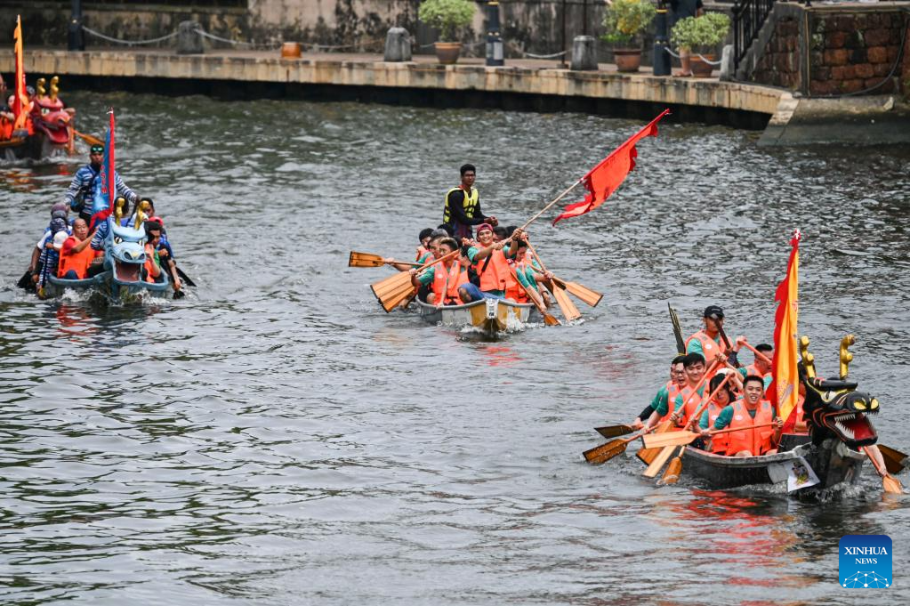 People attend a dragon boat race to greet the upcoming Dragon Boat Festival in Malacca, Malaysia, June 18, 2023. Activities like Zongzi making and dragon boat race were held in Malacca to greet the upcoming Dragon Boat Festival. (Xinhua/Cheng Yiheng)