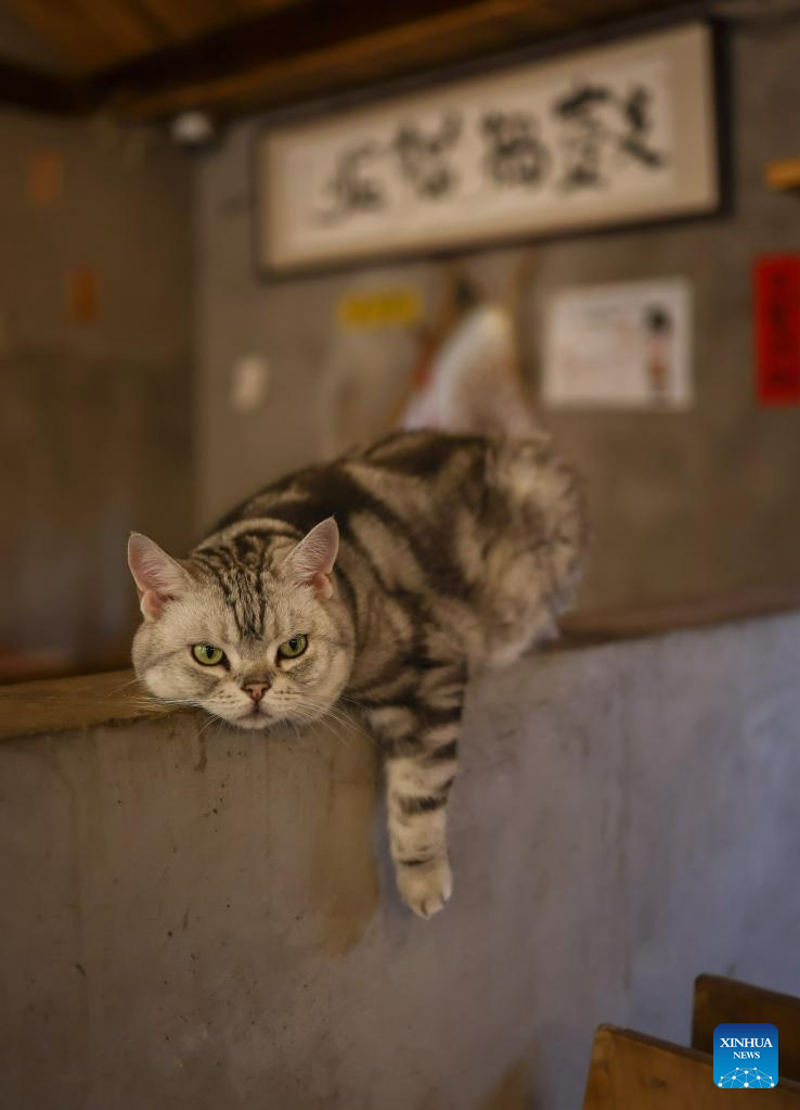 Cat Xiaomei is pictured at Gudaomaone cat cafe in Xiaojuer Hutong of the Nanluoguxiang neighborhood in Beijing, capital of China, June 7, 2023.