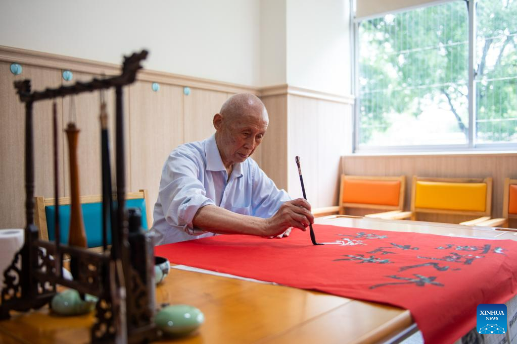 A senior resident practices calligraphy at a nursing home in Hanshou County of Changde City, central China's Hunan Province, June 20, 2023.
