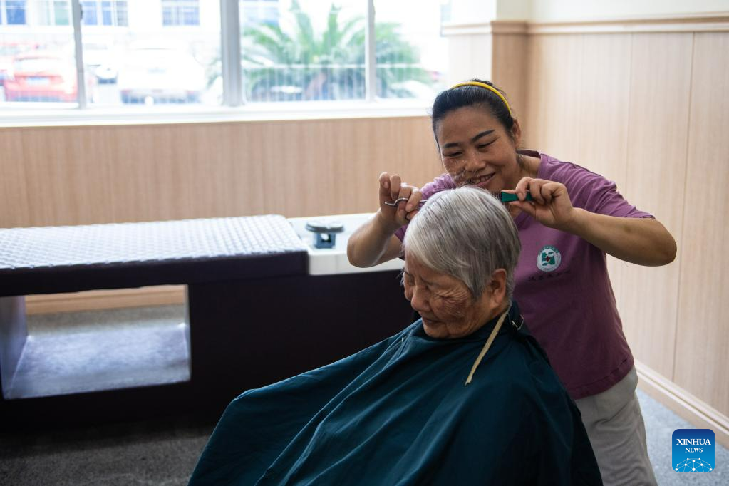 A staff member gives a haircut for a senior resident at a nursing home in Hanshou County of Changde City, central China's Hunan Province, June 20, 2023.