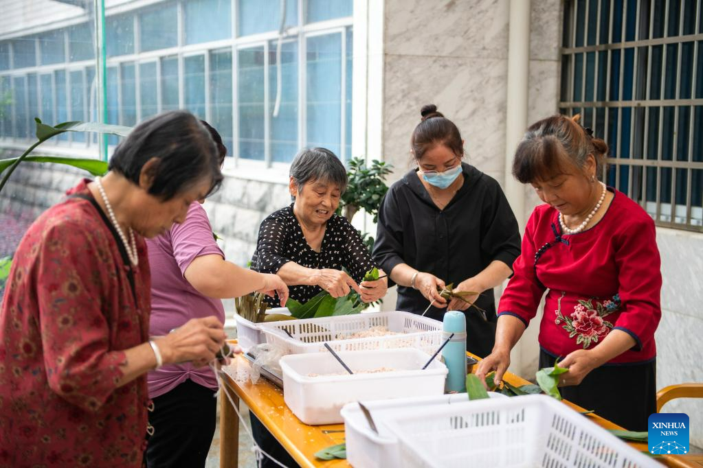 Senior residents make Zongzi, a pyramid-shaped dumpling made of glutinous rice wrapped in bamboo or reed leaves, at a nursing home in Hanshou County of Changde City, central China's Hunan Province, June 20, 2023.