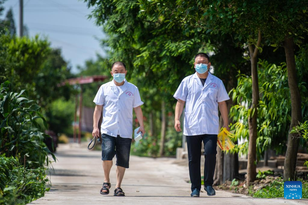 Medical workers walk to provide door-to-door health care service for senior residents at a community in Anxiang County of Changde City, central China's Hunan Province, June 21, 2023.